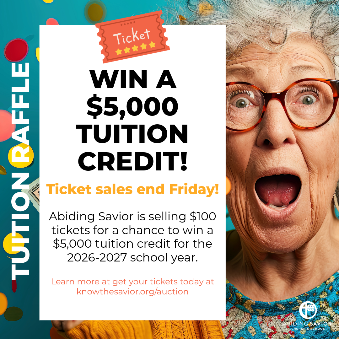 Take a chance to win big while supporting our Abiding Savior community! Purchase a tuition raffle ticket for $100 for a shot at a $5,000 tuition credit* for next year. Whether you're a parent, grandparent, or friend, you can enter—and even gift the winnings to a student of your choice.